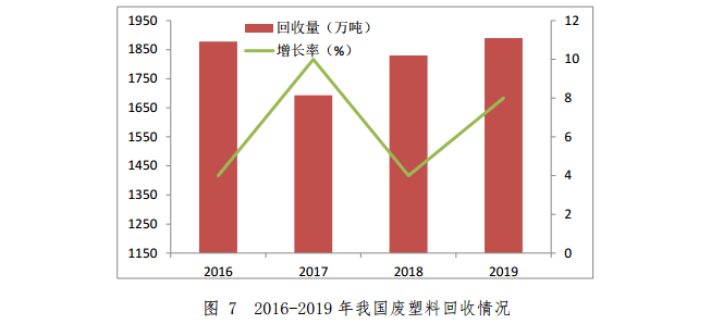 2019年國內(nèi)廢塑料回收量約1890萬噸,較2018年增加了60萬噸,增幅為3.3%。2019年廢塑料進口量幾乎為零。2016-2019年我國廢塑料回收情況如圖7所示。