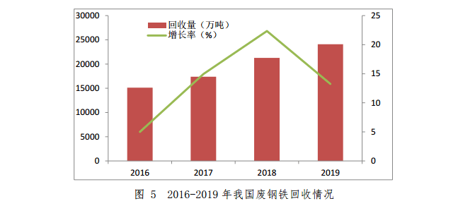 2019年,我國粗鋼和鋼材產(chǎn)量分別為9.96億噸和12.05億噸,同比增長8.3%和9.8%,粗鋼產(chǎn)量再創(chuàng)歷史新高;回收廢鋼鐵約24097萬噸1,同比增長13.3%。其中,重點大型鋼鐵企業(yè)回收廢鋼鐵約21597萬噸,同比增長15.0%;其他企業(yè)回收廢鋼鐵約2500萬噸,與2018年持平;廢鋼單耗為216.7kg/t 鋼,同比增加14.4kg/t鋼,增幅為7.1%,綜合廢鋼比21.67%, 同比增加1.49個百分點。2016-2019年我國廢鋼鐵回收情況如圖5所示。