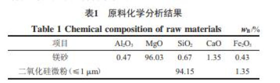 中頻爐爐襯作為感應爐的重要組成部分,不但直接影響熔煉質量,而且還影響生產(chǎn)成本。堿性爐襯具有抗堿性熔渣侵蝕的優(yōu)異性能,不污染鋼液,原料來源豐富,生產(chǎn)工藝簡單,使用方便等優(yōu)點。目前,以硼酸為燒結劑的堿性爐襯應用廣泛,但由于硼酸的強烈助熔作用,導致爐襯的使用壽命短、熔煉成本高。本試驗以二氧化硅微粉為燒結劑,利用其顆粒小、活性大、填???? 粉。該二氧化硅微粉是冶煉金屬硅或硅鐵時,產(chǎn)生的揮發(fā)性SiO或Si氣體遇空氣迅速氧化而成的非結晶相無定形圓球狀顆粒,表面較為光滑,粒度小于1 μm的占87%以上,平均粒徑在0.2~0.3 μm,比表面積為19.2 m2/g,活性高。化學成分分析見表1。表1 原料化學分析結果