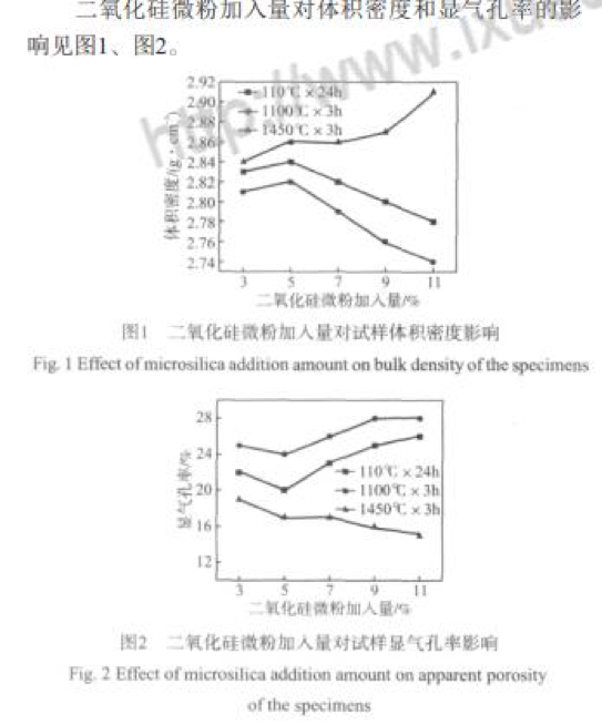 在110 ℃×24 h條件下烘干時,當二氧化硅微粉加 入量小于5%時,由于二氧化硅微粉的顆粒小,分散性 好,可以填充顆粒與顆粒間的空隙[1],這使材料顆粒堆 積的致密度逐漸提高,氣孔率減少,體積密度逐漸增 加 (圖1);隨著二氧化硅微粉加入量的增加,材料中的氣孔率逐漸減少,材料致密度逐漸增加,體積密度 就逐漸增大;當二氧化硅微粉加入量大于5%時,隨著 二氧化硅微粉加入量的逐漸增多,二氧化硅微粉充填 空隙后出現(xiàn)過剩導致材料堆積致密度下降;同時大量 的二氧化硅微粉水化產(chǎn)物烘干后失去自由水和部分結 合水導致材料氣孔率逐漸增大 (圖2),從而使試樣的 體積密度逐漸減小。 在1 100 ℃×3 h條件下燒結,試樣體積密度普遍小 于110 ℃×24 h樣品的體積密度 (圖1),而氣孔率普遍 高于1 10 ℃×24 h樣品的 (圖2)。因為在1 100 ℃時, 由于燒成溫度低,試樣達不到燒結溫度,材料內(nèi)部形 成的液相量少,不足以填充空隙以提高材料的致密度; 在此溫度下,試樣的主要變化是二氧化硅微粉水化產(chǎn) 物的完全脫水,二氧化硅微粉加入量越多,二氧化硅 微粉水化產(chǎn)物脫水引起氣孔率增加而導致體積密度減 小的影響就越強,故隨著二氧化硅微粉加入量的增大, 試樣的體積密度呈減小的趨勢;同時作為結合劑的二 氧化硅超微粉在升溫過程中發(fā)生晶型轉化,引起試樣 體積膨脹[2],體積密度變小。 在1 450 ℃×3 h條件下燒結,試樣體積密度普遍增 大 (圖1)。隨二氧化硅微粉加入量的增加,試樣體積 密度逐漸增大,氣孔率逐漸降低 (圖2)。在1 450 ℃ 下,鎂質澆注料中的MgO和SiO2生成鎂橄欖石[3],即: 2MgO+SiO2→2MgO·SiO2,這使材料燒結,體積收縮, 結構致密程度提高,體積密度增大。隨二氧化硅含量 的增加,2MgO·SiO2生成量逐漸增加,體積密度逐漸 增大,氣孔率逐漸降低。