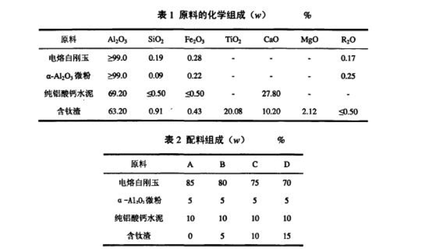 試驗(yàn)用主要原料為電熔白剛玉、活性葉舢203微粉、純鋁酸鈣水泥、含二氧化鈦工業(yè)渣以及AC.H.Z200 等有機(jī)添加劑,其化學(xué)組成如表l所示。