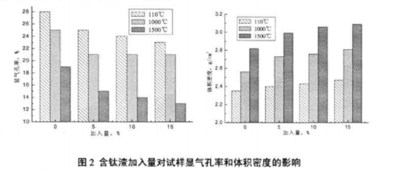圖2所示為音鈦渣加入量對試樣顯氣孔牢、體積密度的影響。由圖可以看出.在熱處理后,試樣的 顯氣孔率和體積密度隨者含鈦渣的增加而呈現(xiàn)明顯的變化規(guī)律。試樣的顯氣孔率隨含鈦渣的增加而下 降,體積密度隨著含鈦渣的增加而上升。添加了古鈦渣的試樣相比空白樣而占,其顯氣孔牢有明顯的下 降,體積密度顯著增加.尤其是在1500℃的高溫處理后.舍釷渣試樣和空白樣的顯氣孔率和體積密度差 異明顯,這與上部分對試樣的線盤化率的影響分析相對應(yīng)。隨著熱處理溫度的升高,試樣的顯氣孔率減 小,體積密度相應(yīng)增大,明顯是含鈦渣的促燒原因。