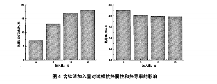 圖4所示為含鈦渣添加量對試樣抗熱震性和1000℃時(shí)熱導(dǎo)率的影響。由圖可以看出,含鈦渣的加入 明顯提高了試樣的抗熱震性,降低了試樣的熱導(dǎo)率,且隨著含鈦渣加入量的增加熱震次數(shù)呈上升趨勢、 熱導(dǎo)率呈下降趨勢。但隨著含鈦渣加入量增加,試樣的抗熱震性和熱導(dǎo)率改善趨緩,這可能是由于試樣 中雖有大量鈦酸鋁形成且量逐步增大,但試樣由于燒結(jié)好而致密化導(dǎo)致了未現(xiàn)明顯改善趨勢。
