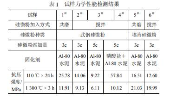 表1是以不同種類、不同添加量的硅微粉為結(jié)合劑和以磷酸鹽、Al-80水泥為固化劑的澆注料力學(xué)性能檢測結(jié)果。由表1可見,硅微粉的種類、加入方式、添加量以及固化劑種類對試樣的力學(xué)性能影響較大。由1#、2#試樣和5#、6#試樣的檢測結(jié)果可見,與硅微粉的直接攪拌加入方式相比,共磨加入方式能明顯改善澆注料的力學(xué)性能。由3#、4#試樣的檢測結(jié)果可見,固化劑種類對澆注料性能影響較大,并可看出磷酸鹽與Al-80水泥組成的復(fù)合固化劑具有明顯改善修補料性能的效果,而Al-80水泥則效果不明顯。由2#、3#試樣的檢測結(jié)果可見,硅微粉添加量的提高未能提高澆注料的力學(xué)性能。由采用相同的加入方式而硅微粉來源不同的1#、5#和2#、6#試樣的檢測結(jié)果可見,??瞎栉⒎叟c武鋼硅微粉相比,能明顯改善澆注料熱處理后的力學(xué)性能,并且添加??瞎栉⒎鄣臐沧⒘峡箟簭姸入S試樣的熱處理溫度的提高而不斷增大。綜合可見,宜采用埃肯硅微粉作為鎂質(zhì)澆注料的結(jié)合劑,合適的添加量應(yīng)為3c%左右。