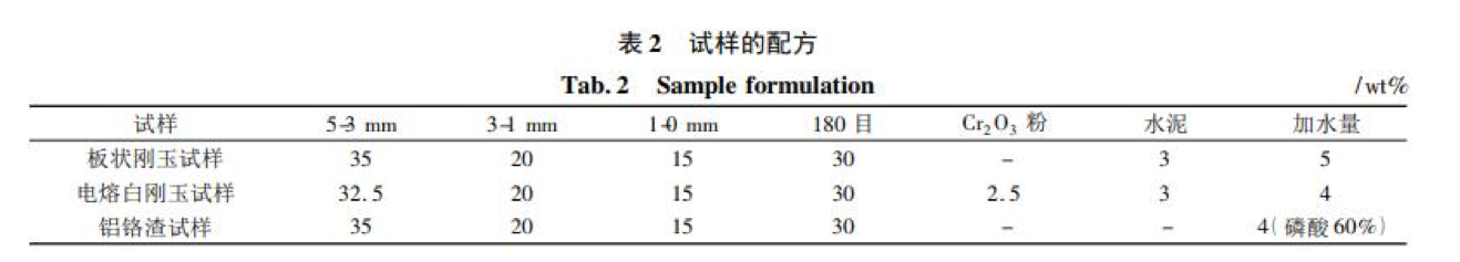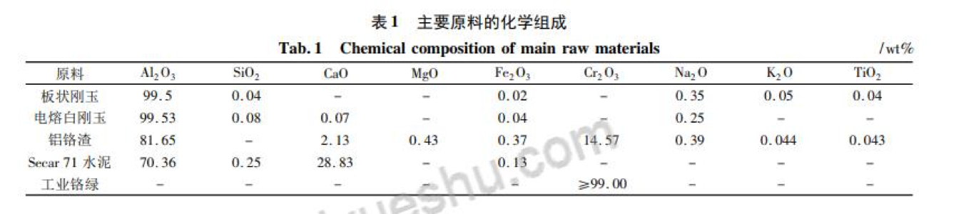 實驗用主要原料有板狀剛玉( 5 ~ 3 mm、3 ~ 1 mm、1 ~ 0 mm 和≤0. 088 mm) 、電熔白剛玉( 5 ~ 3 mm、3 ~ 1 mm、1 ~ 0 mm 和≤ 0. 088 mm) 、鋁鉻渣( 5 ~ 3 mm 、3 ~ 1 mm、1 ~ 0 mm 和≤ 0. 088 mm) 、純鋁酸鈣水泥( Secar 71) 、磷酸溶液( 濃度 60% ) 和工業(yè)鉻綠。板狀剛玉體積密度 5. 53 ~ 5. 57 g·cm - 3,吸水率為 1. 0% ~ 1. 09% ,顯氣孔率約 4. 1% ~ 4. 8% ; 電熔白剛玉體積密度 3. 54 ~ 3. 70 g·cm - 3,吸水率為 2. 43% ~ 2. 58% , 顆粒料的顯氣孔率約 6. 1% ~ 7. 4% ; 鋁鉻渣顆粒體積密度為3. 29 ~ 3. 37 g·cm - 3,吸水率為 4. 2% ~ 4. 6% , 顯氣孔率 10. 3% ~ 12. 1% 。原料的化學組成見表 1。
