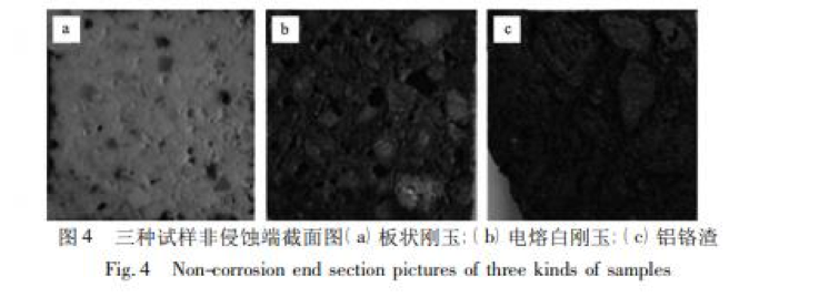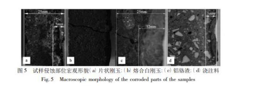 對上述四種中頻爐內(nèi)襯試樣侵蝕部位進行觀察如圖 5 所示。試樣寬度均為 25 mm,板狀剛玉試樣被侵蝕約 5 mm, 電熔白剛玉試樣未觀察到宏觀侵蝕,鋁鉻渣試樣被侵蝕約 12 mm,坩堝澆注料試樣被侵蝕約 5 mm,按公式 ( 1) 計算試樣侵蝕指數(shù)如表 3 所示。 侵蝕指數(shù) R = 侵蝕面積 測量面積 × 100%