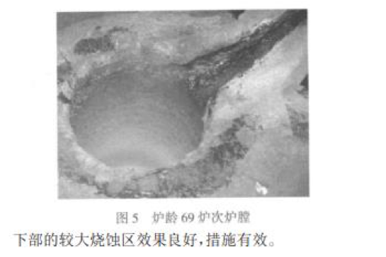 本次試驗爐齡 79 爐次達到了預(yù)期壽命,說明試 驗方案合理,試驗成功。從試驗過程中觀察到:中期 燒結(jié)有效地減緩了爐襯的損耗速度,措施有效;兩次 中修均達到了預(yù)期目的,使用短坩鍋中修應(yīng)對爐膛下部的較大燒蝕區(qū)效果良好,措施有效。