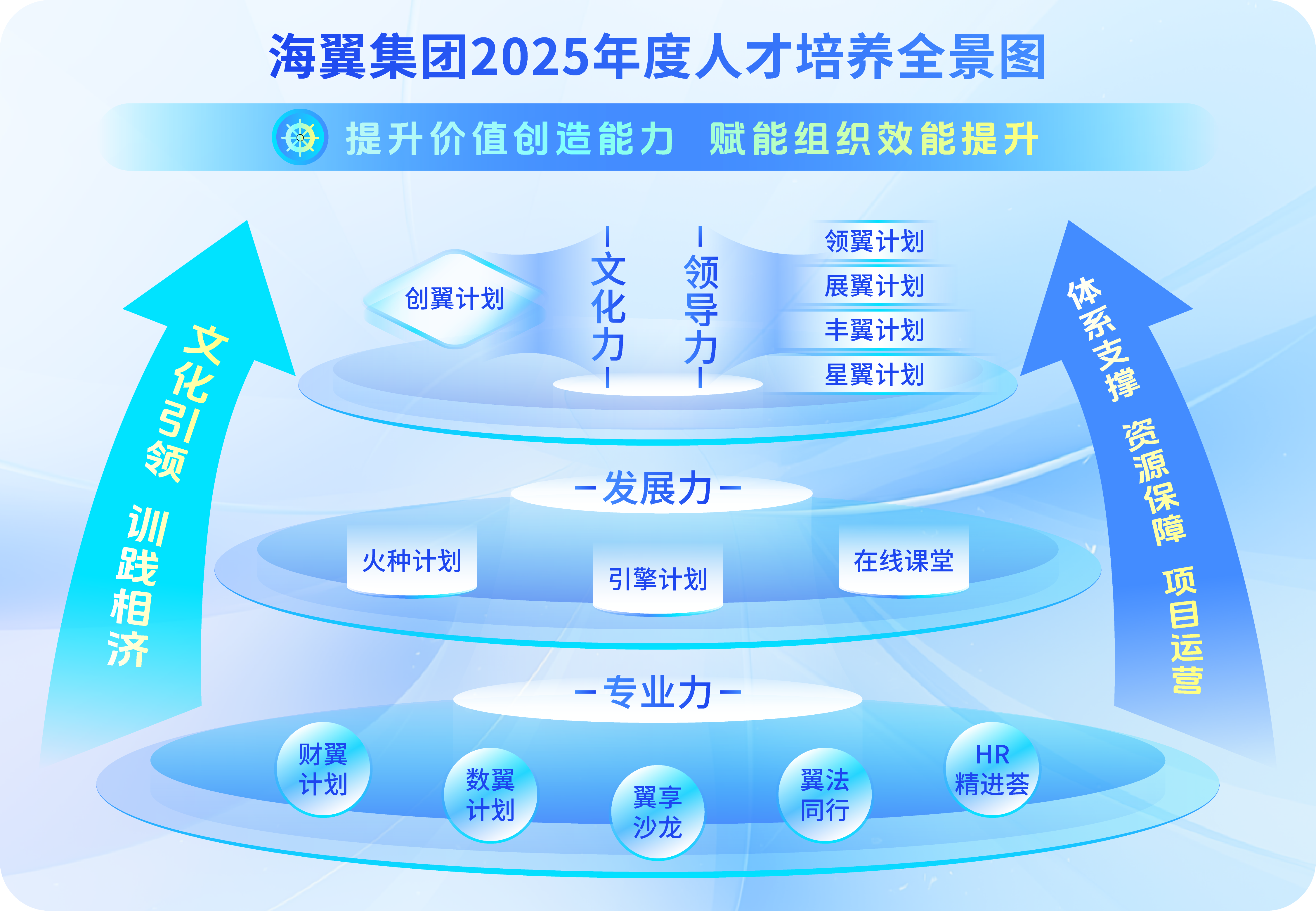 2025年海翼集團人才培養(yǎng)緊扣“強鏈拓圈,向新求質(zhì)”主題,以“提升價值創(chuàng)造能力,賦能組織效能提升”為使命,以“文化引領(lǐng)、訓(xùn)踐相濟”理念為指導(dǎo),以“體系支撐、資源保障、項目運營”為支柱,厚植“文化力”、鍛造“領(lǐng)導(dǎo)力”、夯實“發(fā)展力”、提升“專業(yè)力”,構(gòu)建“四力聚能”培訓(xùn)體系,培育“文化認(rèn)同、領(lǐng)導(dǎo)卓越、專業(yè)過硬”的優(yōu)秀人才隊伍。